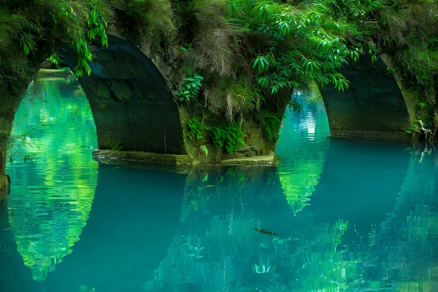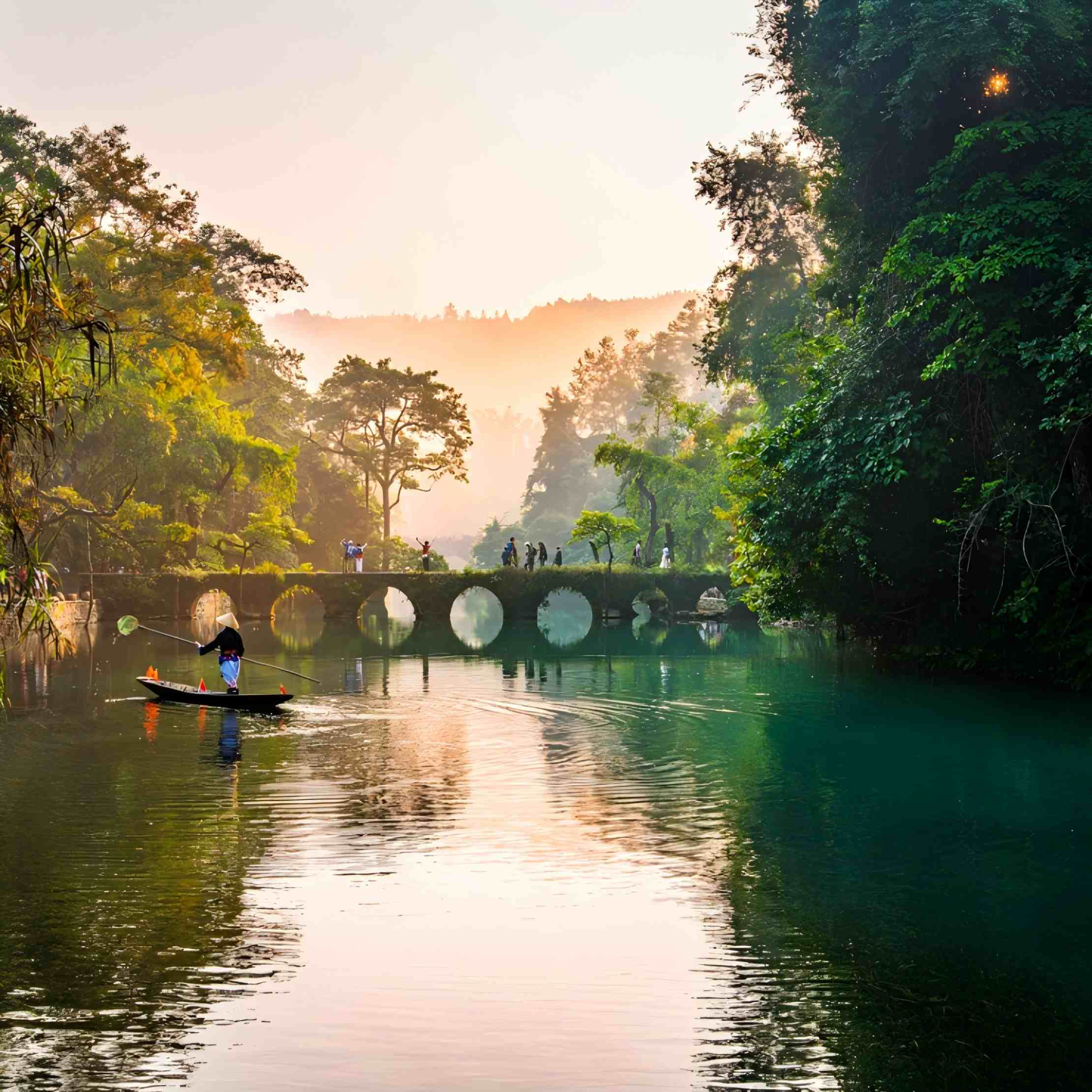 小七孔石桥桥身两侧蔓草丛生,桥下之水清澈见底,两岸景致葱郁秀美,仙气缭绕,漫步于小七孔古桥之上,仿佛置身于一幅山水画卷之中。