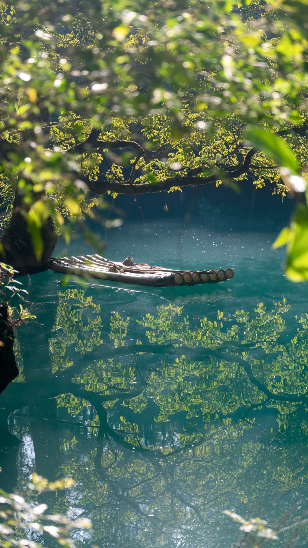 鸳鸯湖郁郁葱葱的树木生长在湖水之中,划着游船在湖中穿梭,从船中向下看,湖水清澈见底;而远观其色,湖面上的绿更能惊艳人心。