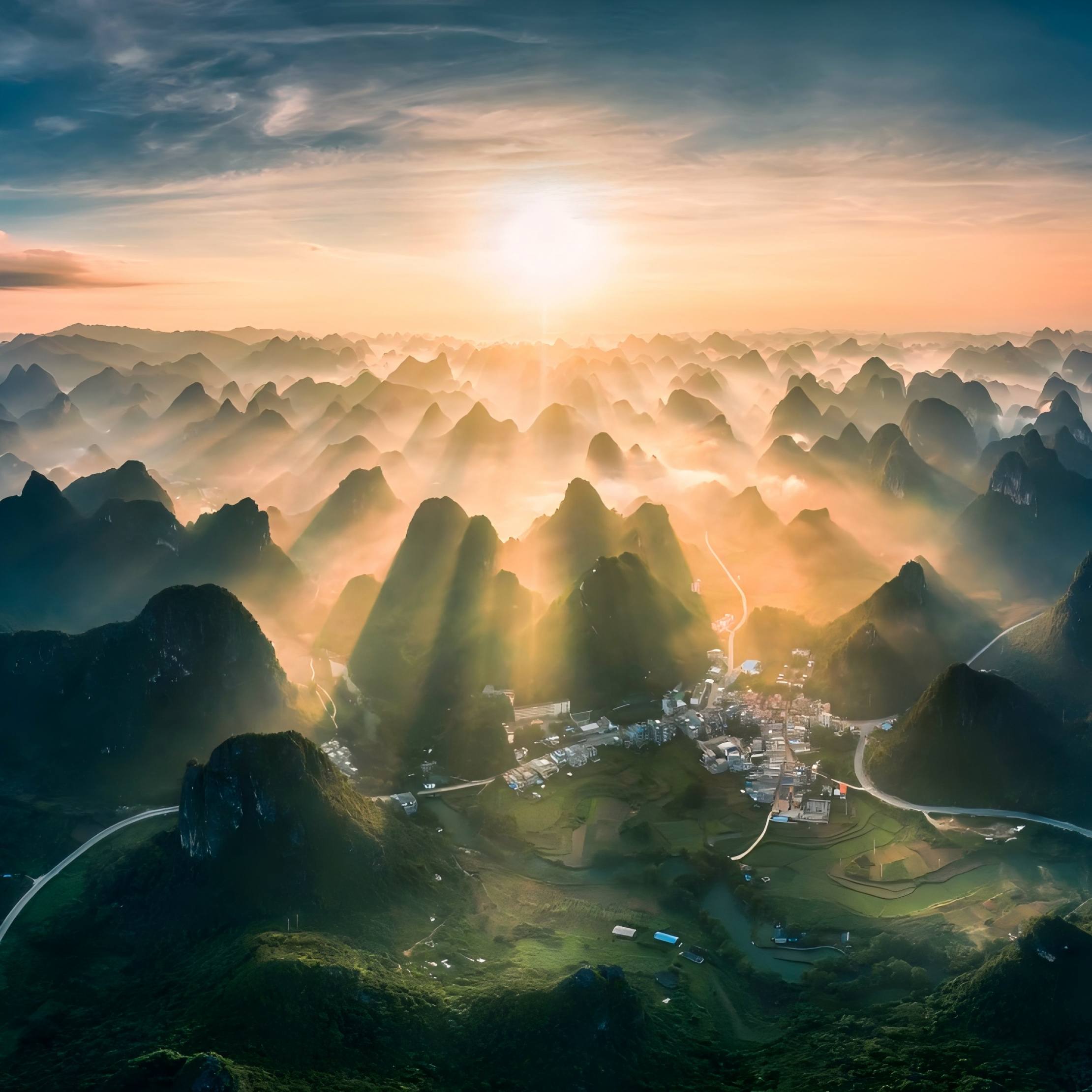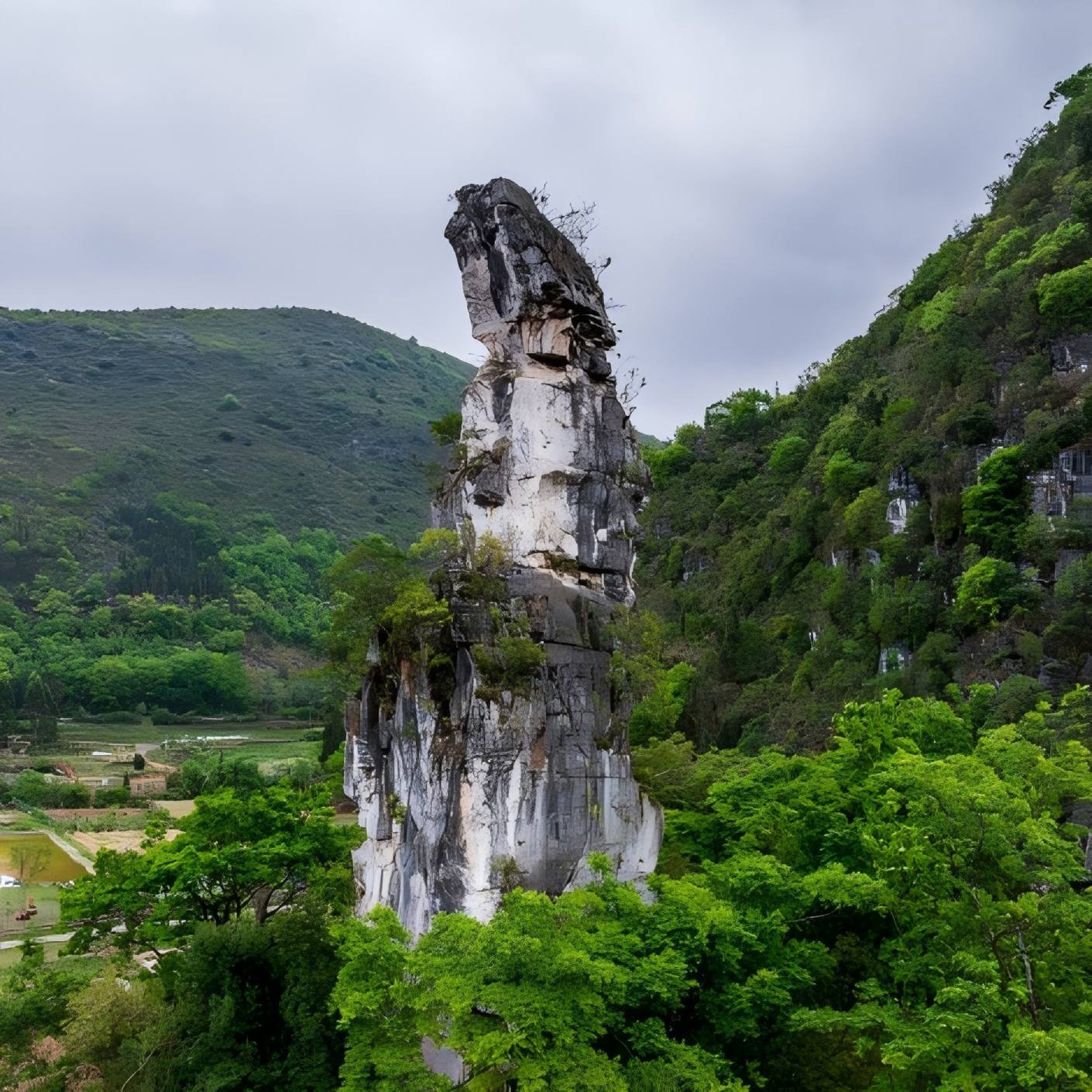众星捧月在一片平坦的田园中央,一座孤峰傲然独立,宛如一轮“满月”,而在其周围,数十座大小不一、形态各异的山峰呈环形层层环绕,仿佛一群“星辰”在虔诚地拱卫着中心的“明月”。