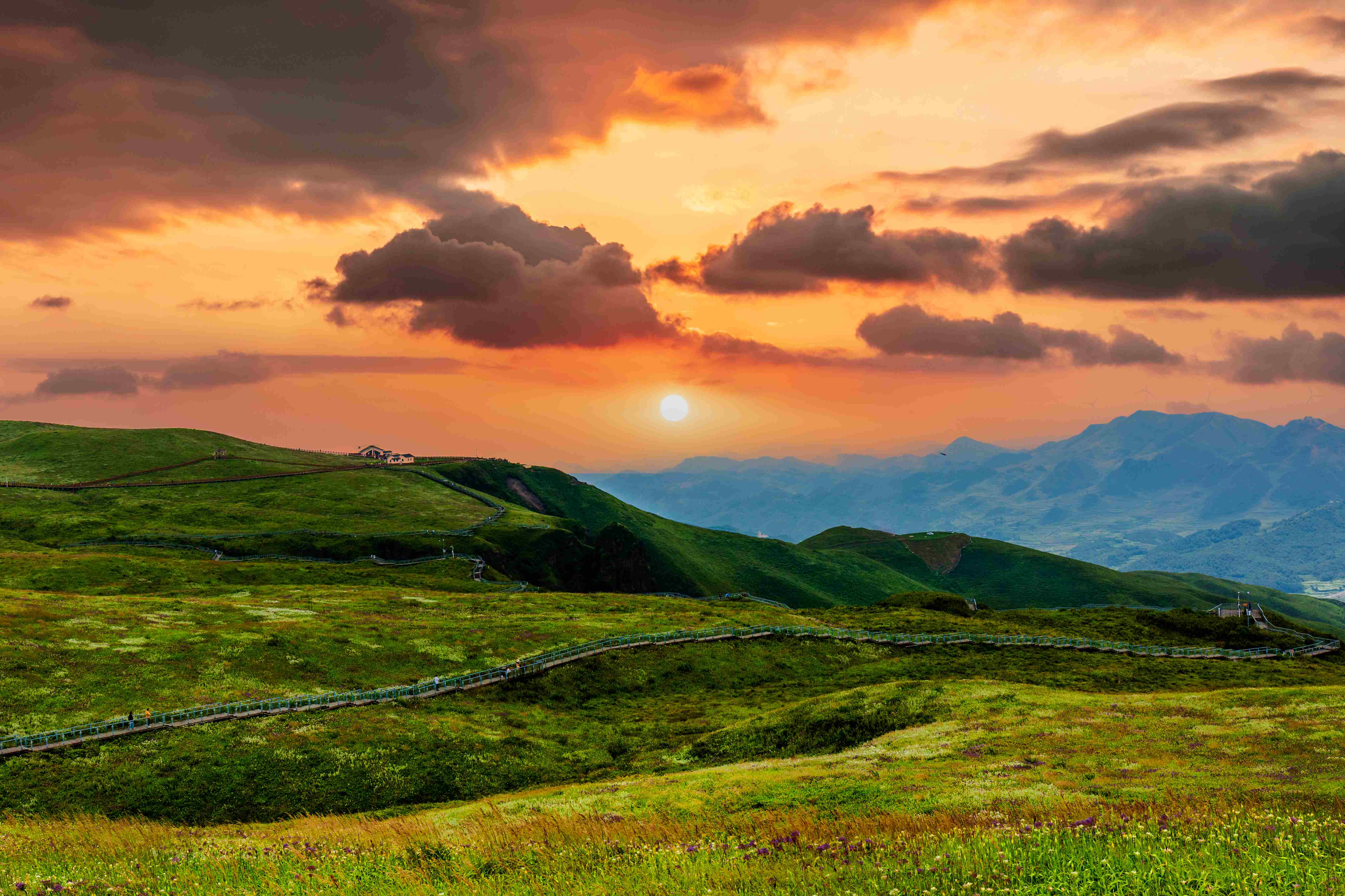 阿西里西大草原位于毕节市赫章县,地处乌蒙山区,是西南地区面积较大、海拔较高的天然草场之一。这里有着典型的高原草甸风光,起伏的丘陵草原绵延不绝,被誉为"云上草原"。在这片广袤的绿色海洋中,你可以领略到波浪路、摇摇路等独特的地形景观,感受"地上有路、路上有景"的奇妙体验。穿越原始森林与高山草甸,站在高处俯瞰山下风光,独具魅力。