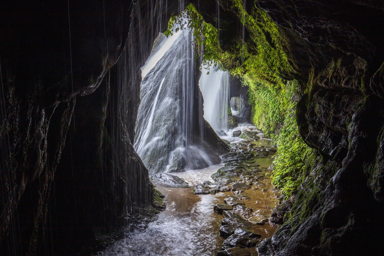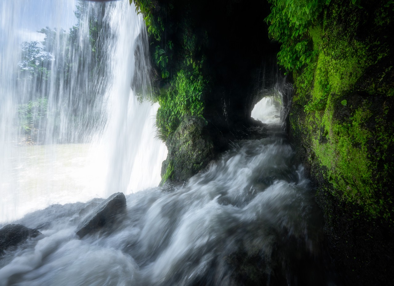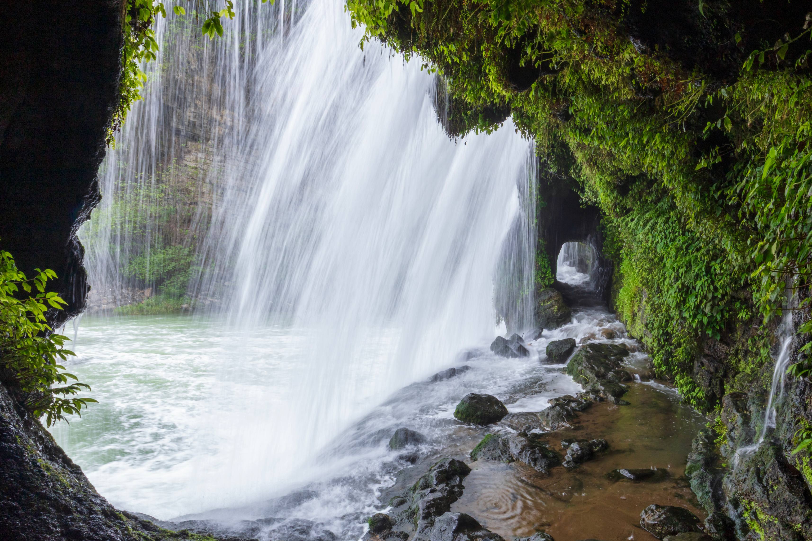 穿洞河瀑布位于瓮安县城北的瓮安河上,是一处典型的喀斯特地貌形成的天然溶洞瀑布。这里最独特之处在于瀑布后方隐藏着一条天然横洞,形成“人从水下过,水在头上流”的奇特景观。穿越洞穴时,透过洞内三个“巨窗”般的开口,可以看到水帘时分时合、时薄时厚的变幻景象。夏季丰水期,瀑布宽达50米的水帘倾泻而下,在阳光下常形成彩虹奇观。